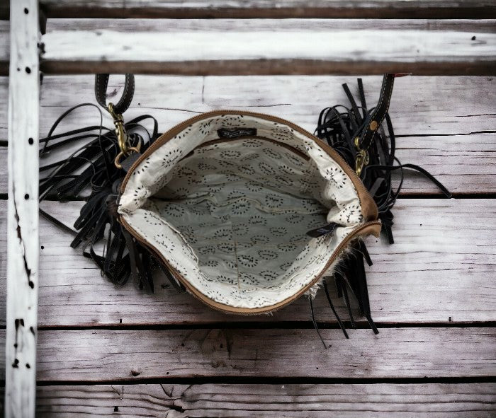 This stunning Myra Bag crossbody has a genuine cowhide front, hand tooled leather top panel, black leather side fringe, woven canvas back, and leather strap. *Note* the genuine hair-on hide pattern will vary by bag. Approximately 11" x 12", adjustable shoulder strap is 22". Side black leather fringe is approximately 14". Top full zipper closure + concealed zippered pouch on the woven canvas back.